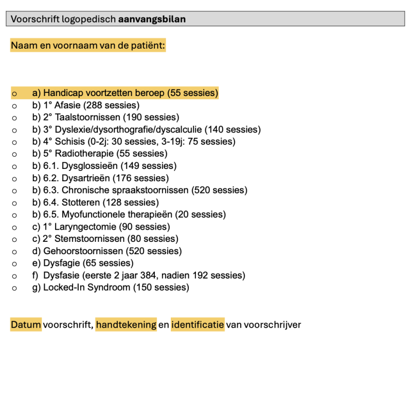De patiënt dient eerst een voorschrift bij u op te halen en dan langs te komen voor het onderzoek op de logopedische praktijk. Als de patiënt geen voorschrift voor een bilan heeft met een datum vóór het logopedisch onderzoek, wordt het bilan niet terugbetaald door het RIZIV.