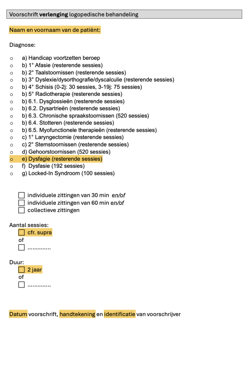 Deze patiënt heeft naast het therapievoorschrift ook een FEES- of VFES-verslag nodig voor de aanvraag tot terugbetaling. Hier moet uit blijken dat er een aspiratierisico of een bedreiging voor de voeding per os aanwezig is