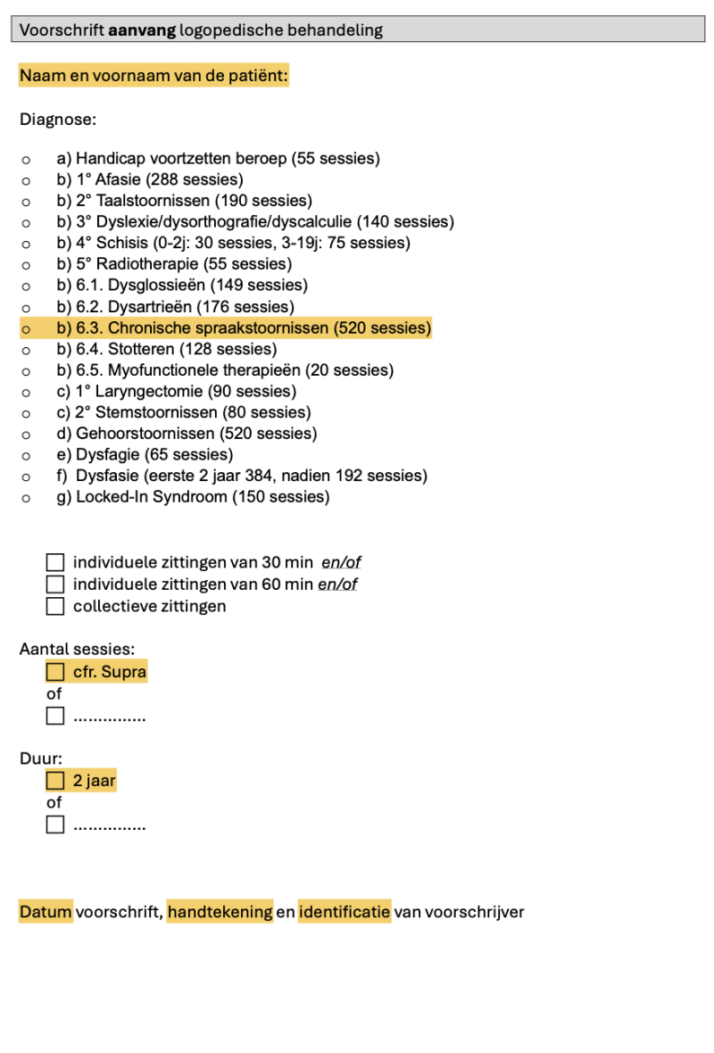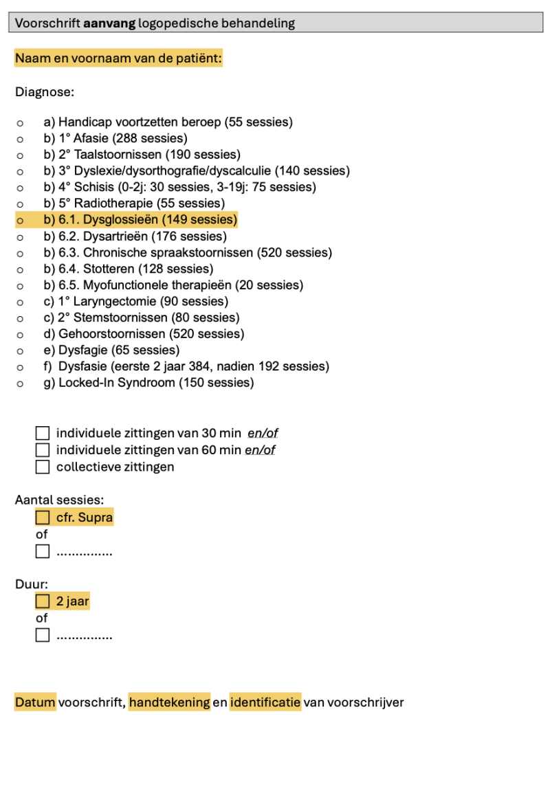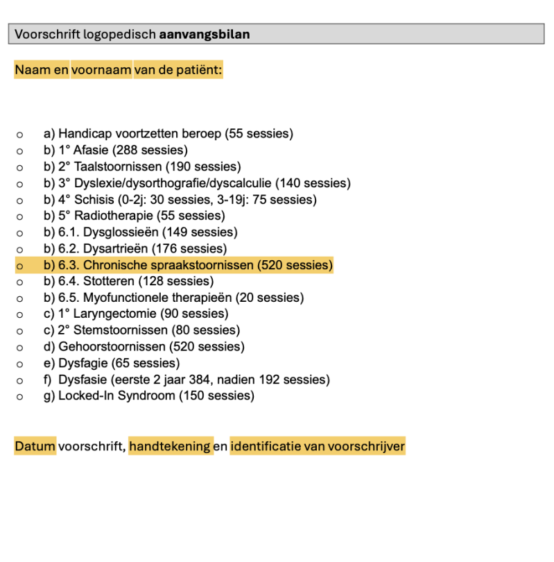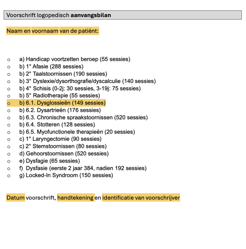 De patiënt dient eerst een voorschrift bij u op te halen en dan langs te komen voor het onderzoek op de logopedische praktijk. Als de patiënt geen voorschrift voor een bilan heeft met een datum voor het logopedisch onderzoek, wordt het bilan niet terugbetaald door het RIZIV.