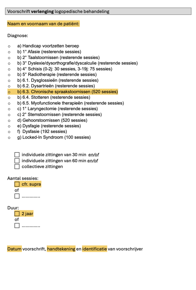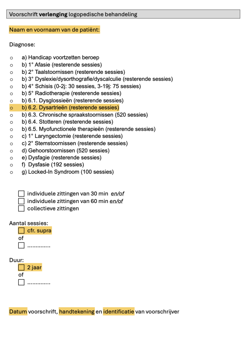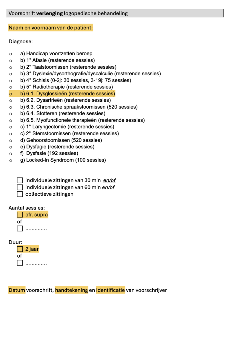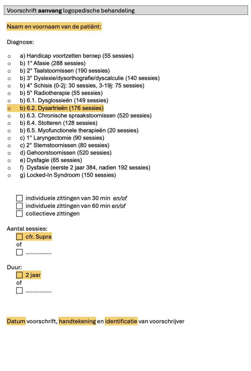 De patiënt dient eerst een voorschrift bij u op te halen en dan langs te komen voor het onderzoek op de logopedische praktijk. Als de patiënt geen voorschrift voor een bilan heeft met een datum voor het logopedisch onderzoek, wordt het bilan niet terugbetaald door het RIZIV.