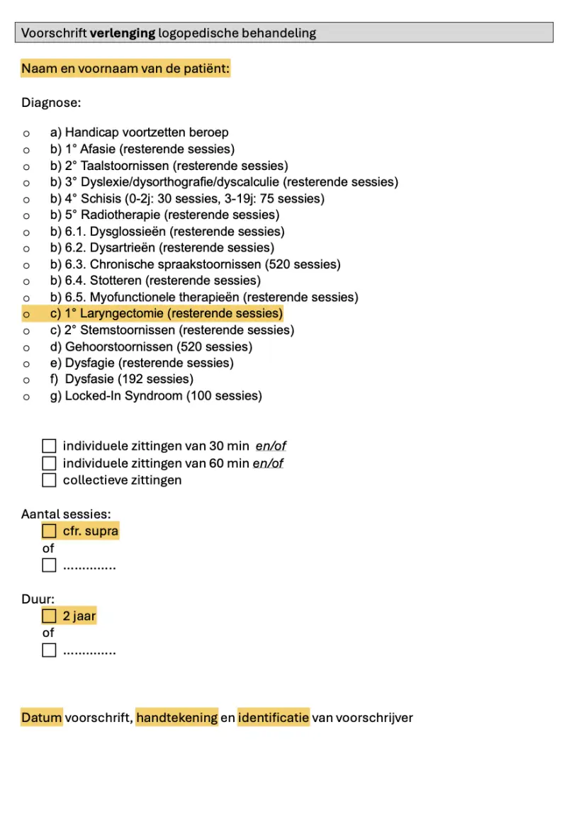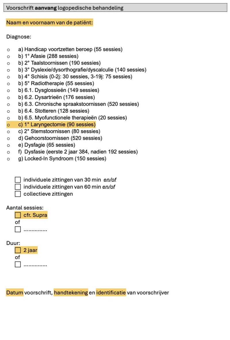 De patiënt kan een voorschrift krijgen als deze een logopedisch bilan aan u kan voorleggen. Met dit voorschrift kunnen patiënten terugbetaling aanvragen voor de logopedische remediëring.