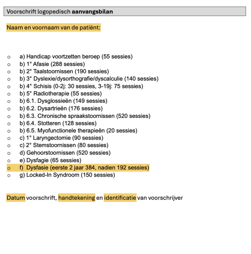 De patiënt kan een voorschrift krijgen als deze een logopedisch bilan aan u kan voorleggen. Met dit voorschrift kunnen patiënten terugbetaling aanvragen voor de logopedische remediëring.